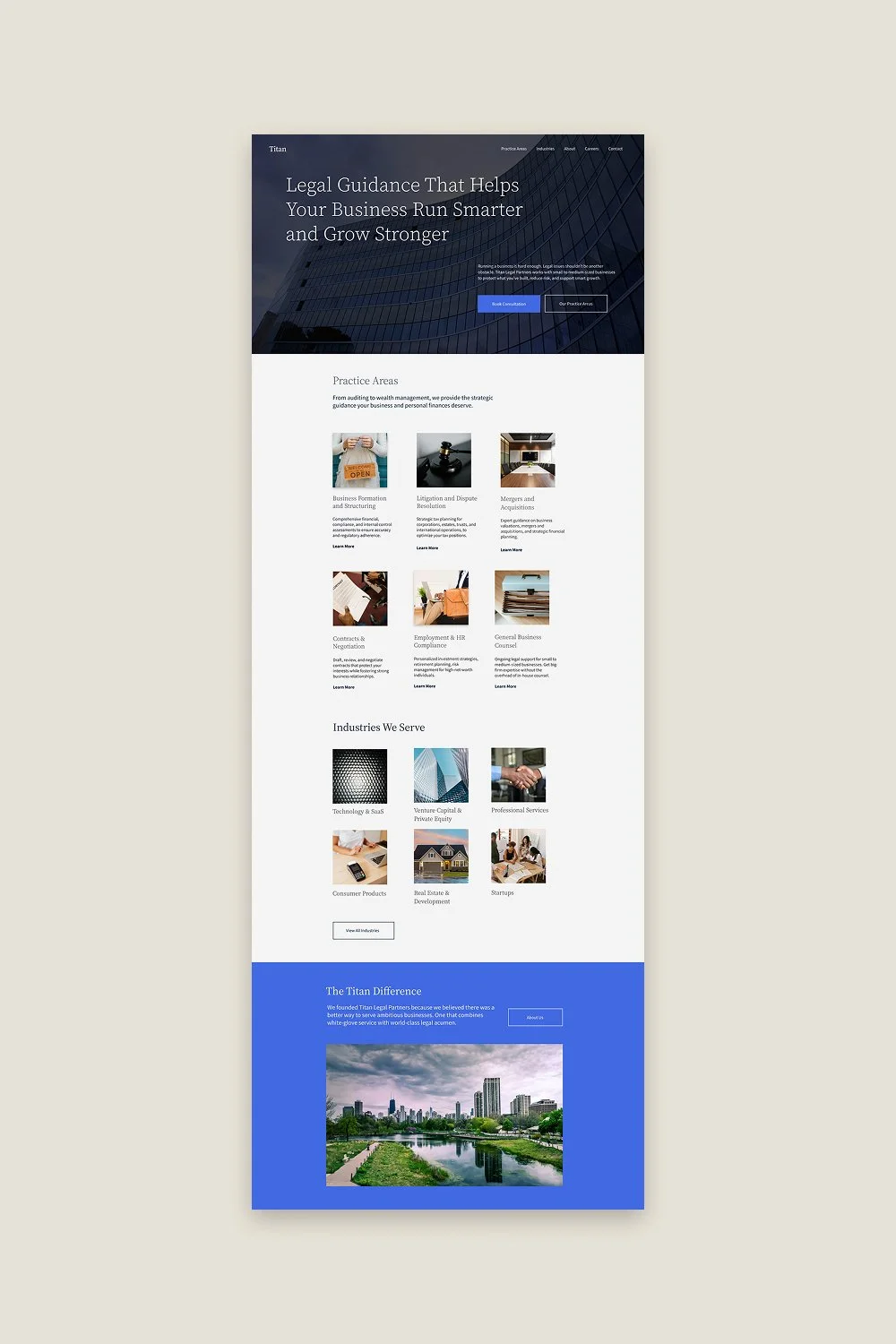 Squarespace templates for law firms and solo attorneys. Designed around how legal clients evaluate counsel online — and what converts a stressed prospect into a booked consultation.