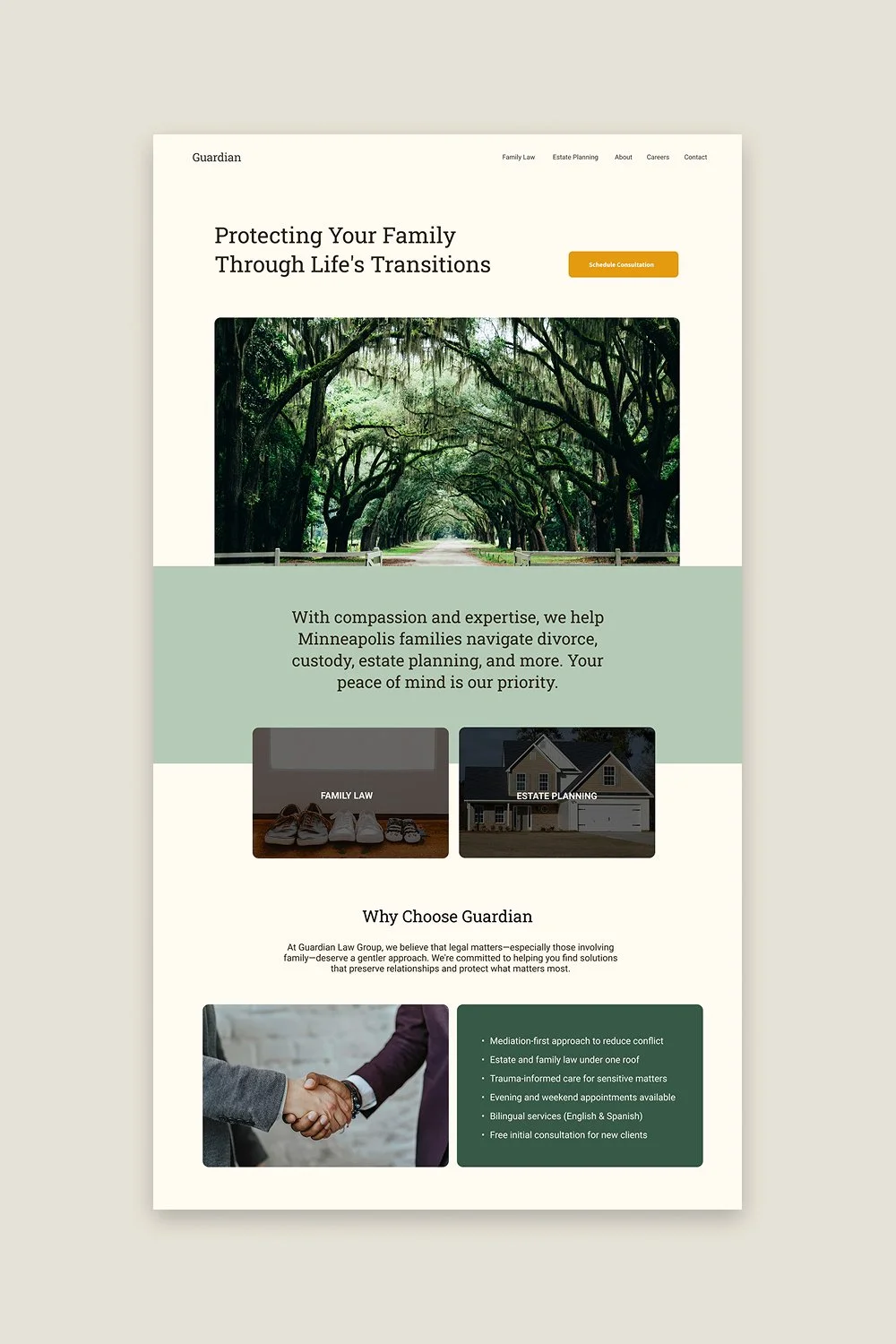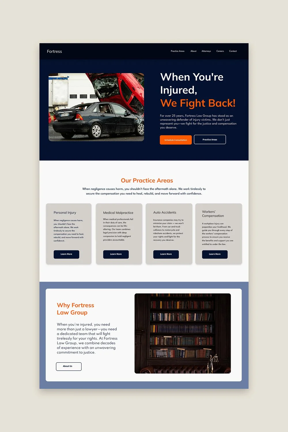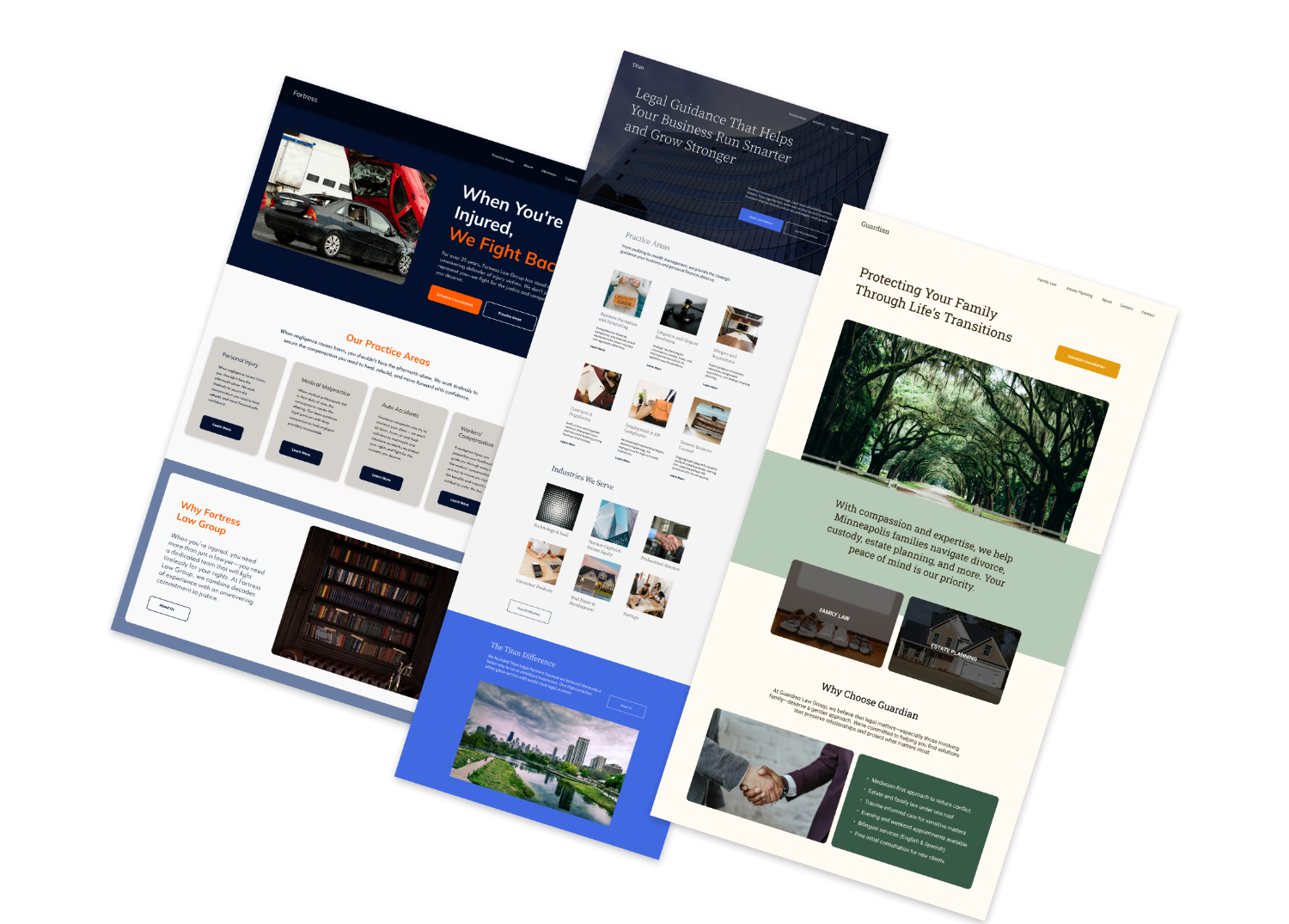 Each practice area needs its own clearly labeled section with dedicated pages. Clients search by problem, not by firm name. Make it effortless to self-select into your relevant service.
